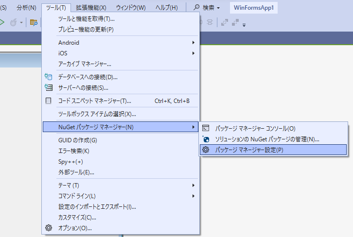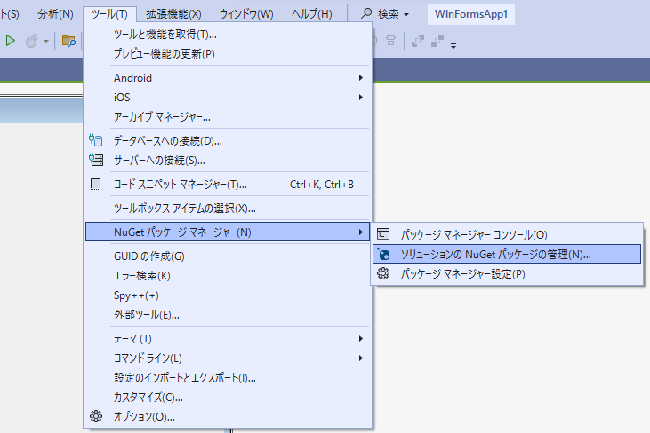 (3) [ツール]-[NuGetパッケージ マネージャー]-[ソリューションのNuGet パッケージの管理]を開きます。