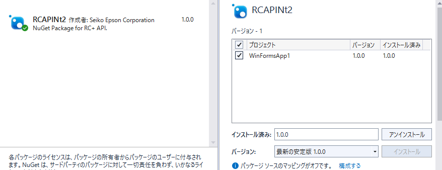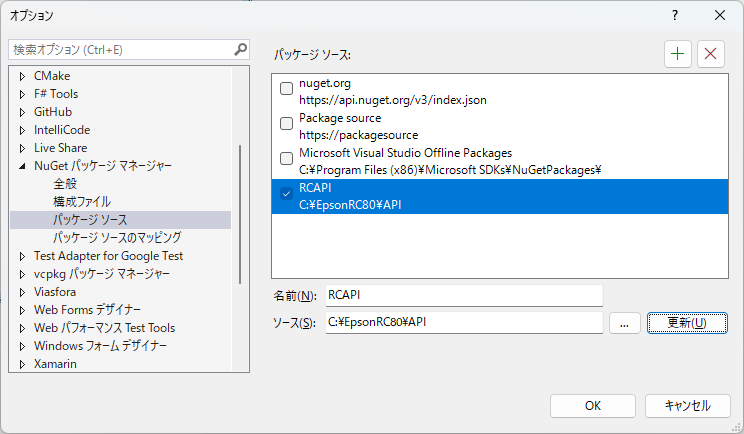 テキストボックスの[名前]: 任意、[ソース]: Epson RC+がインストールされているパス(パスを指定せずにインストールした場合は、C:\EpsonRC80\API)を入力し、[OK]ボタンを押します。