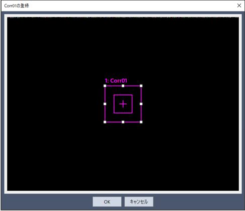 VTrainを実行すると、指定のオブジェクトを表示したライブ画像イメージを示しながら、ダイアログが開きます。オペレーターはサーチウィンドウをサイズ変更したり、移動させたりして、(Correlation, Geometricオブジェクトの)モデルウィンドウを登録できます。登録を完了したら、オペレーターは変更を保存する[OK]ボタン、または変更を保存しない[キャンセル]ボタンをクリックすることができます。[OK]ボタンをクリックすると、カレントプロジェクトに新規情報が自s動的に保存されます。