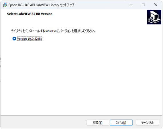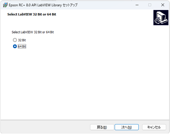 - インストーラーを起動し、使用しているLabVIEWアプリケーションのビットを選択すると、PCにインストールされているバージョンが表示されます。デフォルトでは、最新のバージョンが選択されています。Epson RC+ 8.0 LabVIEW VIライブラリーを使用するバージョンを選択します。