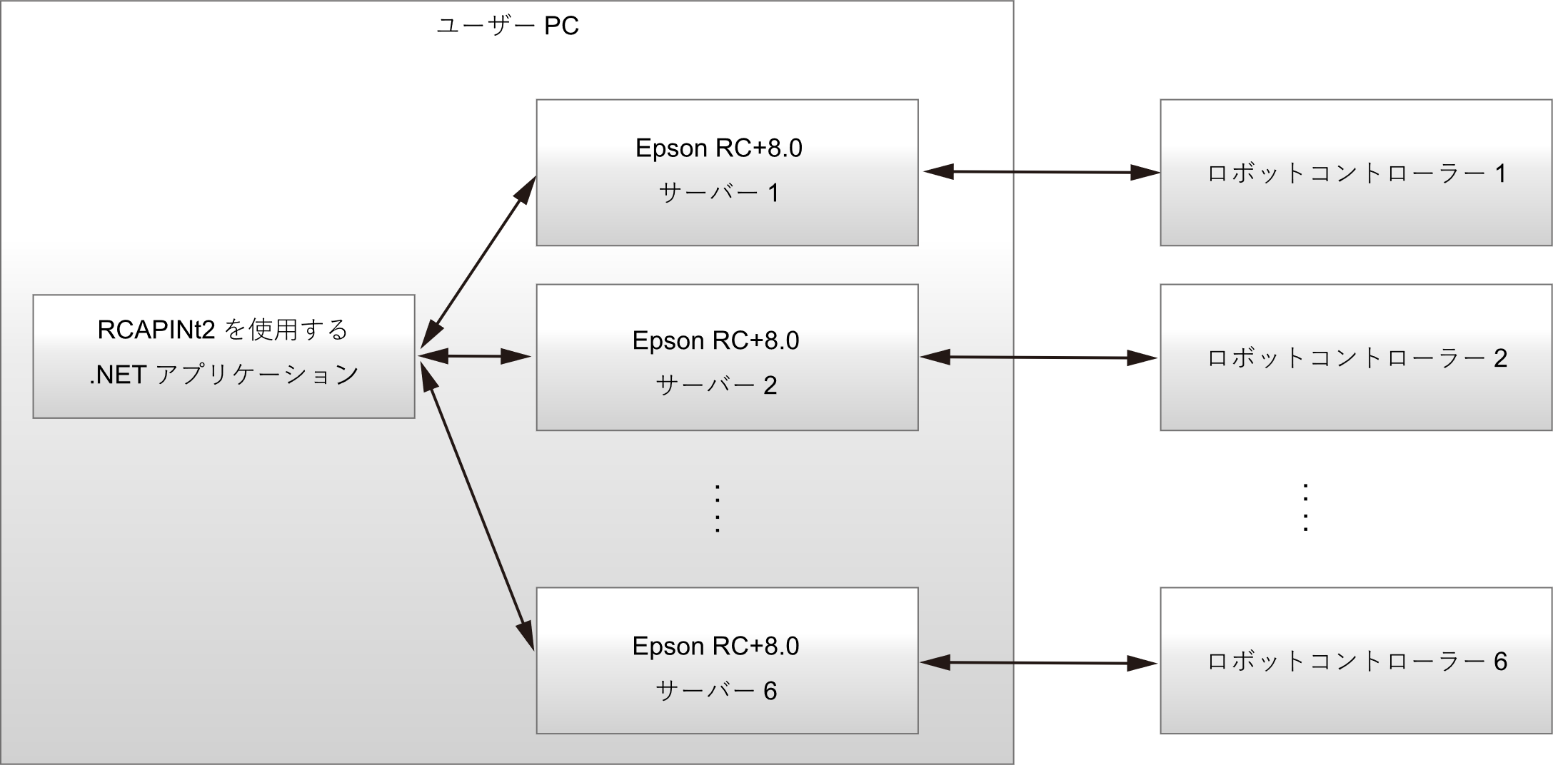 下図は、RC+APIを使用して複数のコントローラーを制御する場合の基本構図を示します。