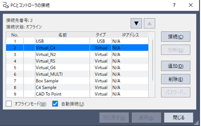 メソッド内の引数は、接続番号を示します。この接続番号は以下のダイアログ (Epson RC+ 8.0メニュー-[セットアップ]-[PCとコントローラ接続])のNo.に該当します。引数に-1を指定した場合、最近使用した接続番号が反映されます。