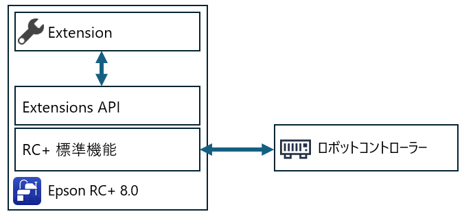 Extensionは、RC+本体プロセス内(インプロセス)で動作します。Extensionは、RC+ Extensions SDKのExtensions APIの公開インターフェースを経由して、RC+標準機能にアクセスするため、RC+内部に直接アクセスできない設計です。これにより、RC+標準機能の整合性を担保しつつ、拡張によるUI追加や機能連携を安全に実現できます。