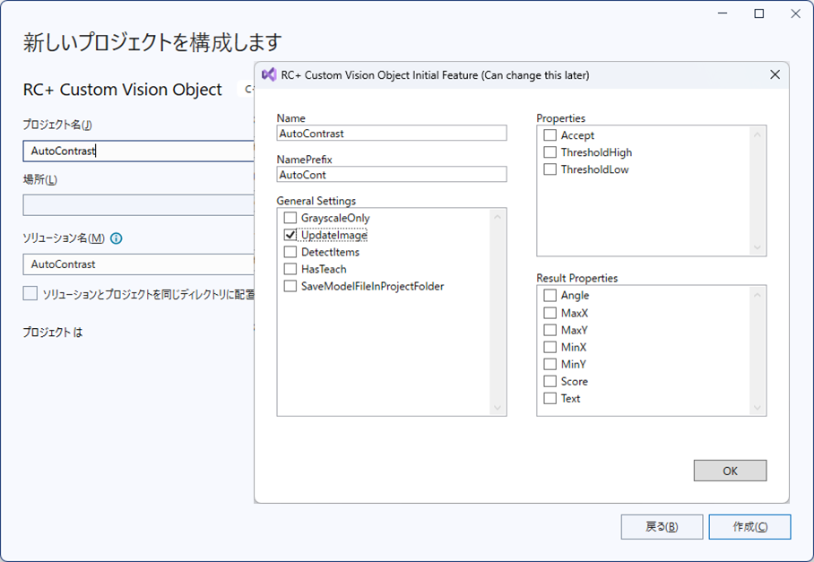 プロジェクトウィザードの作成時には「RC+ Custom Vision Object Feature」画面が表示されますので、あなたのカスタムビジョンオブジェクトのプロファイル情報を入力してください。