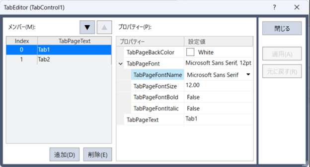 フォーム設計時に、TabControlのタブページのテキストのフォントを変更することができます。(フォント名、スタイル、サイズ)