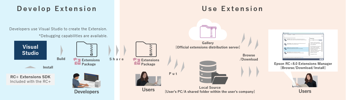 - User: By using the Epson RC+ Extensions Manager, users can browse, download, and install extensions from the Gallery provided by Epson. By specifying a local source, extensions developed by developers can also be used in the same way.