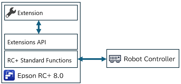 Extension runs within the RC+ main process (in-process). Extension accesses standard RC+ functions via the public interfaces of the Extensions API in the RC+ Extensions SDK, and is therefore not designed to have direct access to the internals of RC+. This ensures the consistency of the RC+ standard functions while safely enabling UI additions and function integration through extensions.
