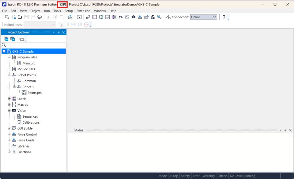 By selecting [Debug]-[Start Debugging] from the menu, the extension is built, and Epson RC+ starts after the build is completed. After Epson RC+ starts, make sure that the selected function (window or menu) is displayed. [EXP] is displayed in the title of the main window to indicate the debug status of the extension.