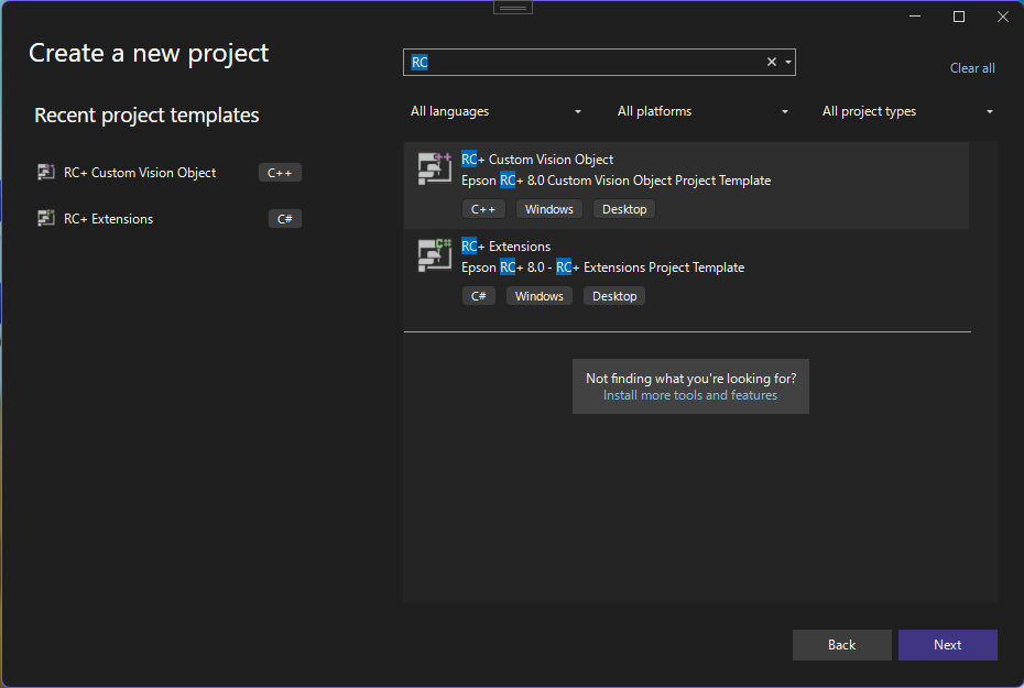 File templates for required functions can be added later. Right-click Solution Explorer and select [Add] - [New item]. Search for [RC+] and add it.