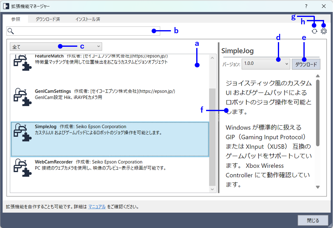 | a | 以下のExtensionが表示されます。 - エプソンから一般公開されているExtension - ローカルソースに配置したExtension |