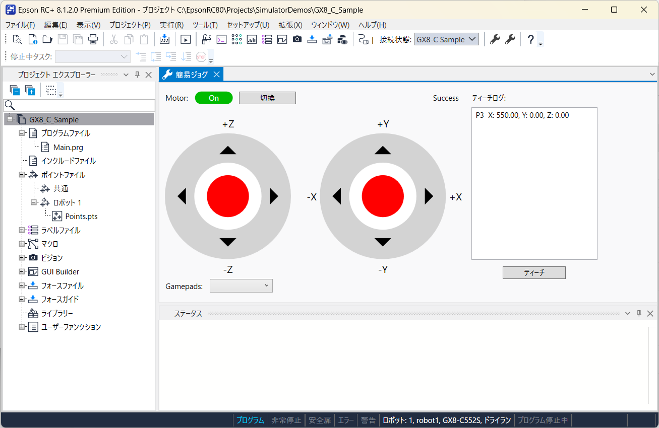 - ジョグに関するパラメーター(ジョグ移動距離、速度など)は、RC+ 全体で共有されています。RC+ 本体の「ジョグ&ティーチ」での変更は、基本的には SimpleJog にも適用されます。今回は、SimpleJog でのパラメーター変更は実装しませんので、必要に応じて本体の「ジョグ&ティーチ」を併用してください。