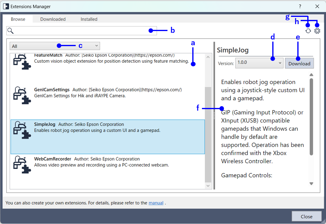 | e | 將下載於「a」中所選 Extension 的「d」中所選版本。 已下載的 Extension 會顯示於 [已下載] 分頁。 |